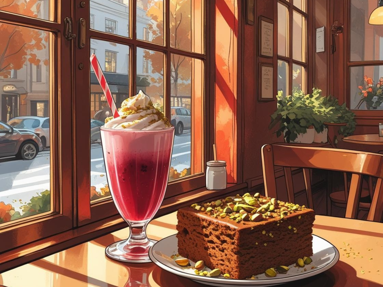 Ești într-o cafenea mică și cochetă, ascunsă de agitația orașului, într-o după-amiază răcoroasă de toamnă. Îți comanzi un milkshake de cireșe, iar lângă el primești o felie de turtă dulce, presărată cu fistic crocant și miere.